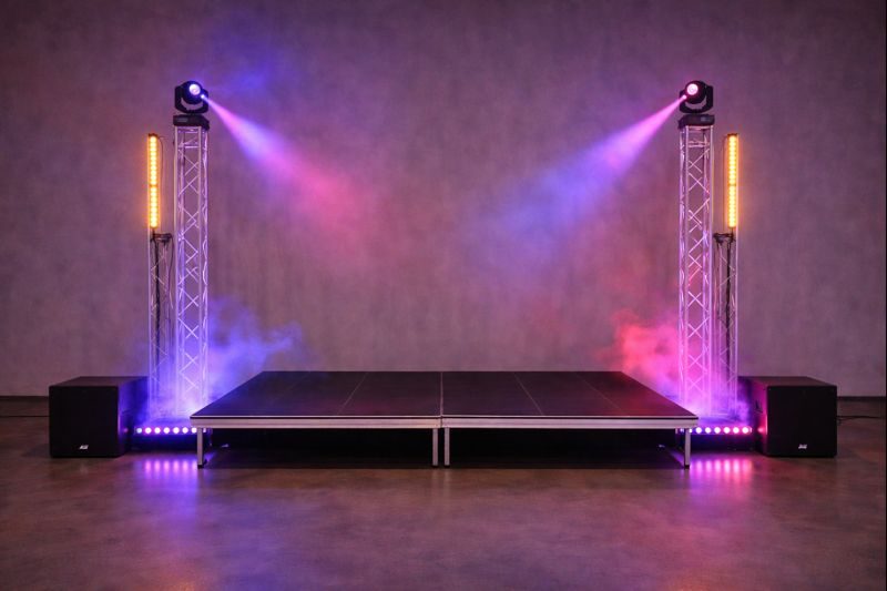 Escenario de 6×4 metros con tarimas modulares para conciertos y eventos medianos. Incluye montaje y seguridad.