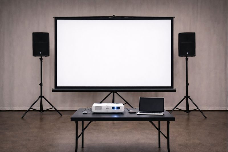 Pack audiovisual con proyector HD y pantalla portátil, ideal para conferencias y presentaciones pequeñas.